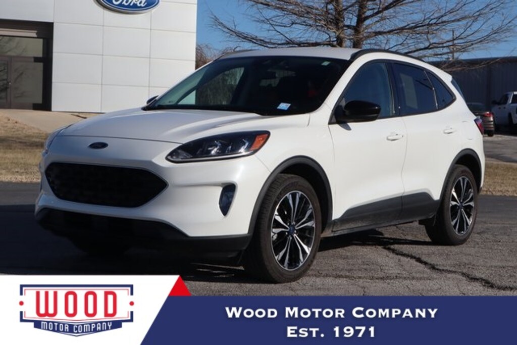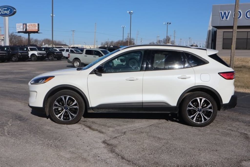 White 2021 Ford Escape SEL AWD 8-Speed Automatic EcoBoost 2.0L I4 GTDi DOHC Turbocharged VCT AWD, 18" Machined-Face Aluminum Wheels, Air Conditioning, Auto High-beam Headlights, Automatic temperature control, Black Upper Window Molding w/Black Beltline Molding, Brake assist, Compass, Delay-off headlights, Driver door bin, Driver vanity mirror, Electronic Stability Control, Equipment Group 302A, Exterior Parking Camera Rear, Front & Rear Black Ford Oval, Front & Rear Floor Liners w/Carpet Mats, Front & Rear Floor Mats w/Logo, Front Bucket Seats, Front Center Armrest, Front dual zone A/C, Front fog lights, Front reading lights, Fully automatic headlights, Gloss Black 5-Bar Upper Grille w/Chrome Surround, Gloss Black Badges & Emblems, Gloss Black Sideview Mirror Caps, Hands-Free Foot-Activated Liftgate, Heated ActiveX Front Bucket Seats, Heated ActiveX Front Sport Contour Bucket Seats, Heated door mirrors, Heated front seats, Heated steering wheel, Illuminated entry, Instrument Panel w/6.5" Digital Screen, Low tire pressure warning, Memory Driver's Seat & Side-View Mirrors, Outside temperature display, Overhead console, Panic alarm, Passenger door bin, Passenger vanity mirror, Power driver seat, Power Liftgate, Power steering, Power windows, Radio: B&O Sound System by Bang & Olufsen, Rear reading lights, Rear seat center armrest, Rear window defroster, Rear window wiper, Remote keyless entry, SEL Stealth AWD Package, Speed control, Speed-Sensitive Wipers, Split folding rear seat, Steering wheel mounted audio controls, Tachometer, Technology Package, Telescoping steering wheel, Tilt steering wheel, Trip computer, Variably intermittent wipers, Wheels: 19" Machined-Face Ebony-Painted Aluminum, Wireless Charging Pad.